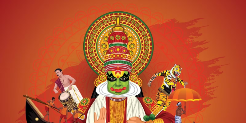 A vibrant and colorful scene captures the essence of Onam, the traditional harvest festival of Kerala. In the foreground, a beautifully adorned Pookalam (floral carpet) is displayed, featuring intricate floral designs created with a variety of colorful blossoms. Surrounding the Pookalam, people are seen engaged in the energetic and rhythmic dance known as Kaikottikali, showcasing the rich cultural heritage of Kerala. Traditional attire, including the white and gold Kasavu sarees worn by women, adds to the visual splendor. The image exudes the festive spirit of Onam, symbolizing joy, unity, and the bountiful harvest season.